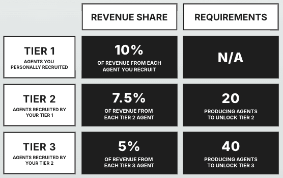 Go deeper: receive 7.5% from agents they refer (Tier 2) and 5% from Tier 3 — building passive income across multiple levels.